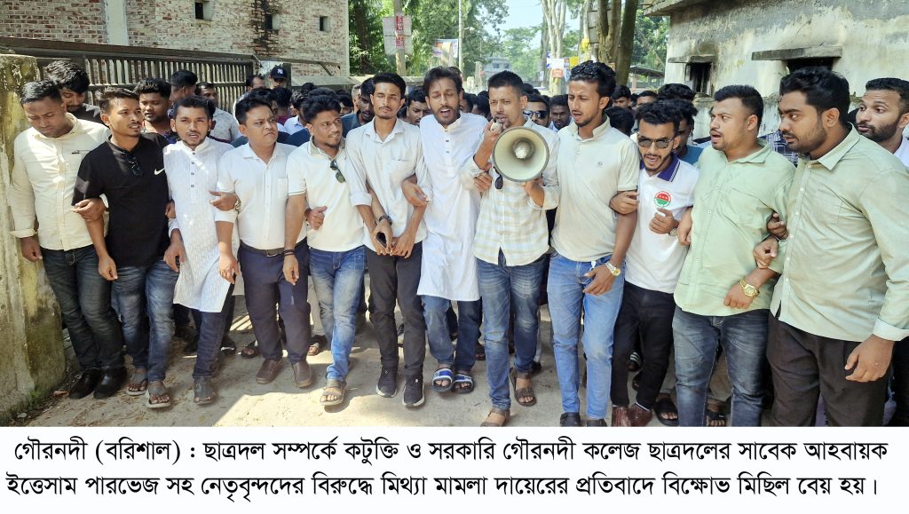 বরিশালের সরকারি গৌরনদী কলেজ ছাত্রদলের সাবেক আহবায়ক ইত্তেসাম পারভেজসহ ৫ নেতার বিরুদ্ধে মিথ্যা মামলা দায়েরের প্রতিবাদে ও অবিলম্বে মামলা প্রত্যাহারের দাবিতে বিক্ষোভ মিছিল ও প্রতিবাদ সভা অনুষ্ঠিত হয়েছে।