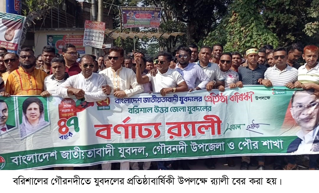 বাংলাদেশ জাতীয়তাবাদী যুবদলের প্রতিষ্ঠাবার্ষিকী উপলক্ষে বরিশালের গৌরনদীতে র্যালী ও আলোচনা সভা অনুষ্ঠিত হয়েছে।