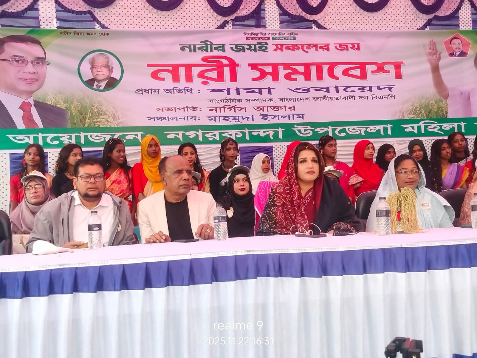 সমাবেশে প্রধান অতিথি হিসেবে উপস্থিত ছিলেন বিএনপির কেন্দ্রীয় কমিটির সাংগঠনিক সম্পাদক শামা ওবায়েদ ইসলাম রিংকু। তিনি বলেন, মহিলা ভোটারদের শক্তি গণতান্ত্রিক আন্দোলনে গুরুত্বপূর্ণ ভূমিকা রাখবে। জনগণের অধিকার ফিরে পেতে ধানের শীষকে বিজয়ী করতে হবে। সমাবেশের সভাপতিত্ব করেন নগরকান্দা উপজেলা মহিলা দলের সভাপতি নার্গিস আক্তার।